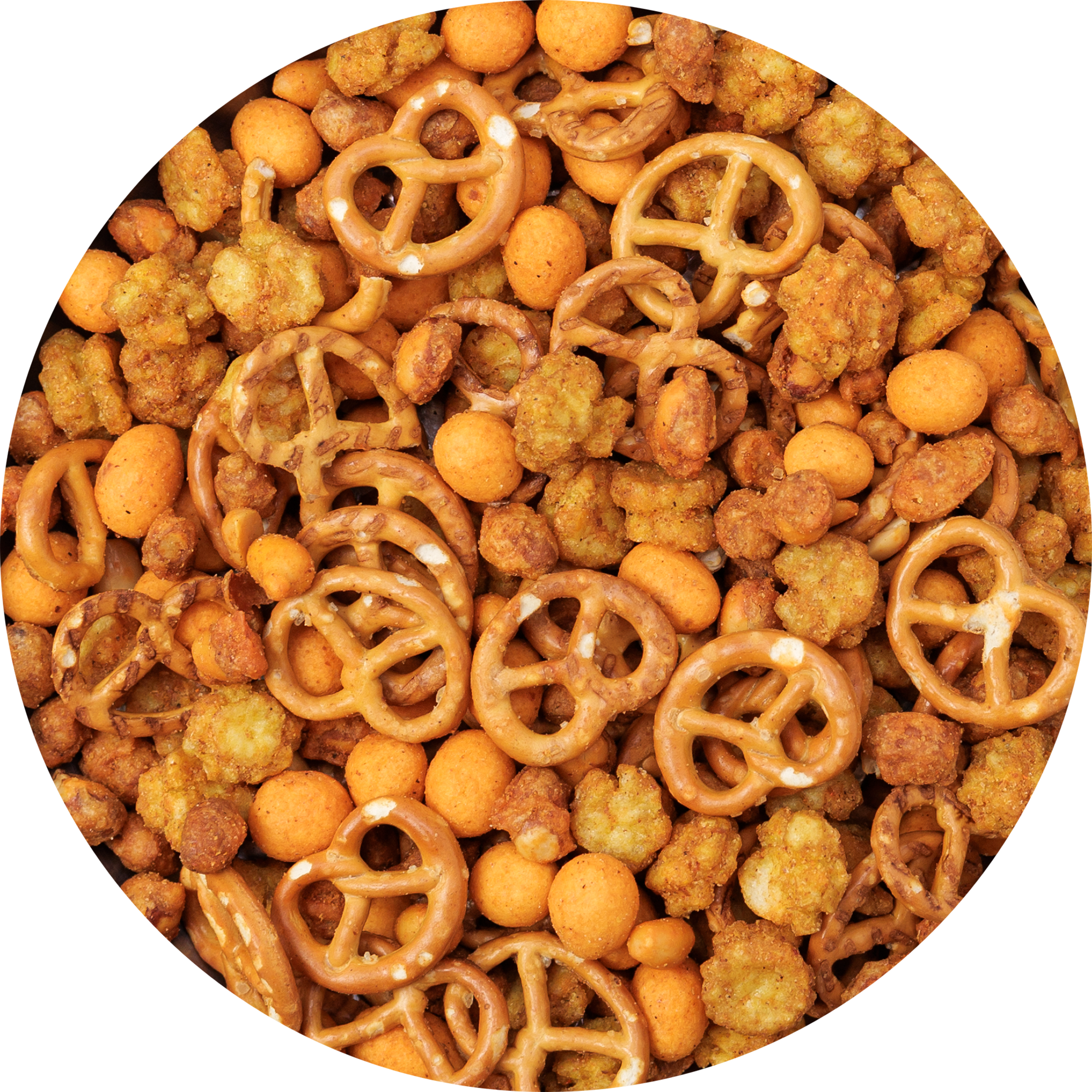Микс от гарнирани фъстъци, бретцели и оризови крекери с вкус на къри