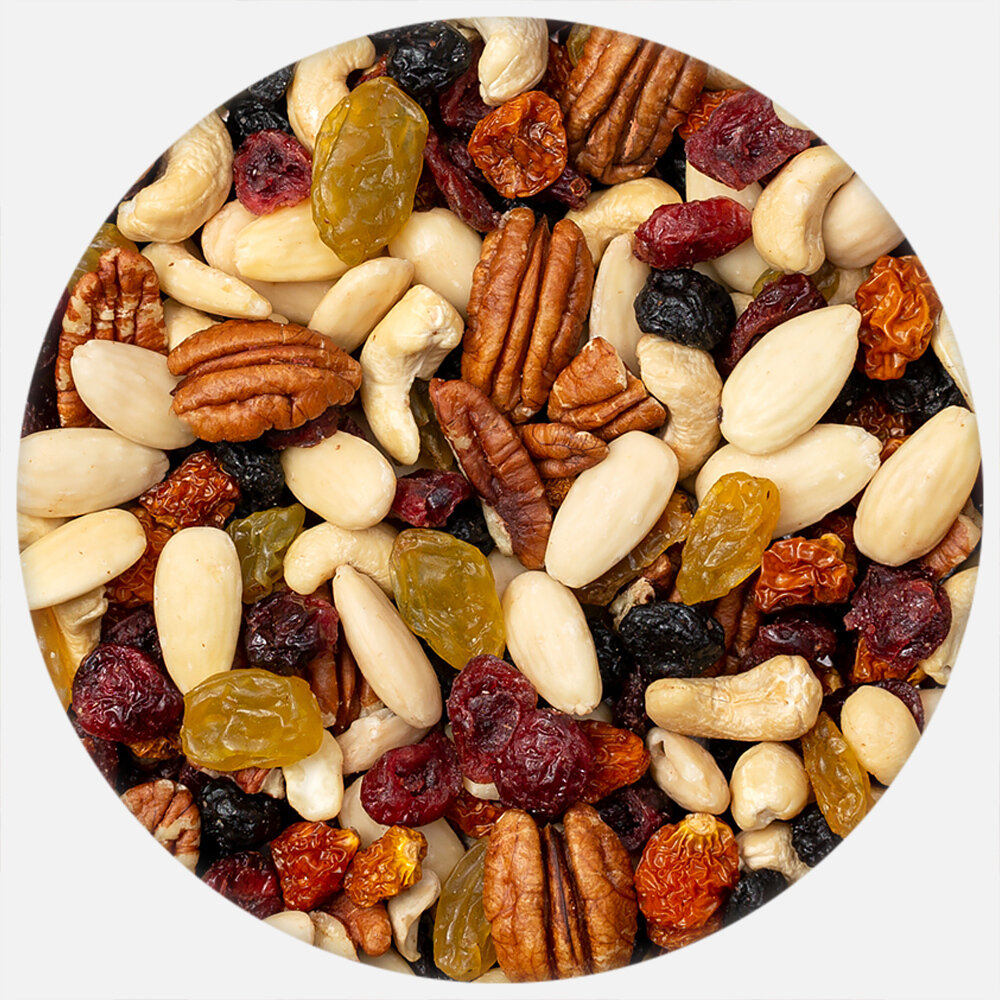 • Пекан суров, бланширан суров бадем, кашу сурово, черна боровинка, червена